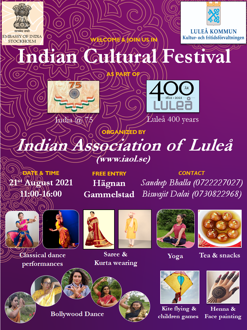 Welcome and join us in Indian Cultural Festival 2021 as part of celebrations of India @ 75 and 400 years of Luleå.